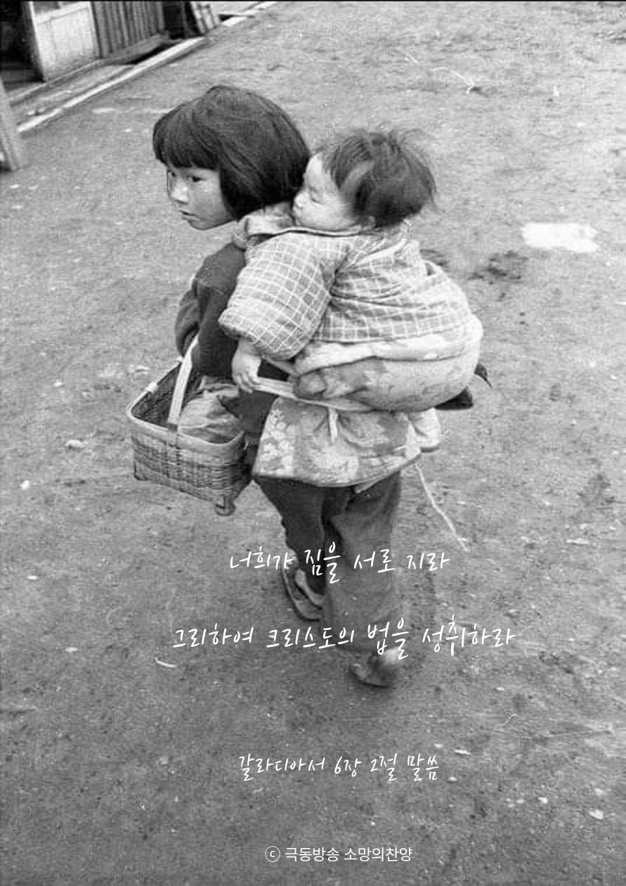동생을 업어주는것이 서로 사랑하며 짐을 나누어 지는것의 한 모습인것 같습니다.