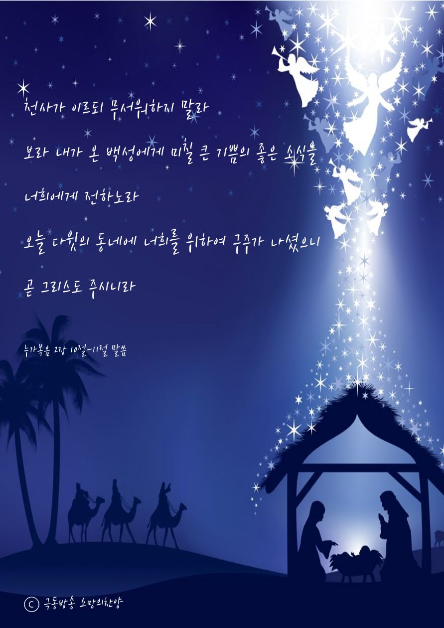 천사가 전했던 그 '큰 기쁨'이 가득 울려 퍼지길 소망합니다.