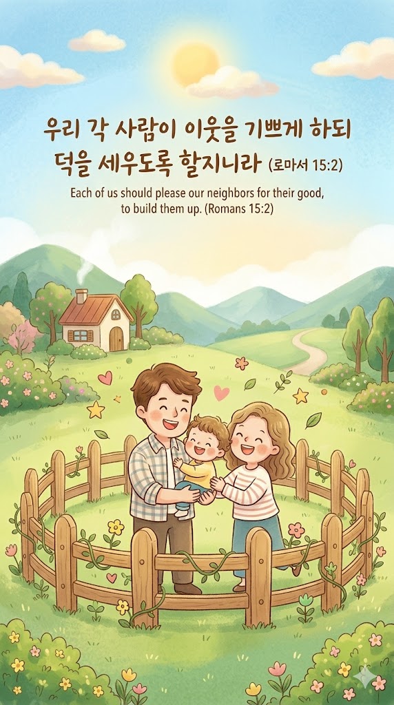 "우리 각 사람이 이웃을 기쁘게 하되 선을 이루고 덕을 세우도록 할지니라" 로마서 15장2절 말씀입니다.