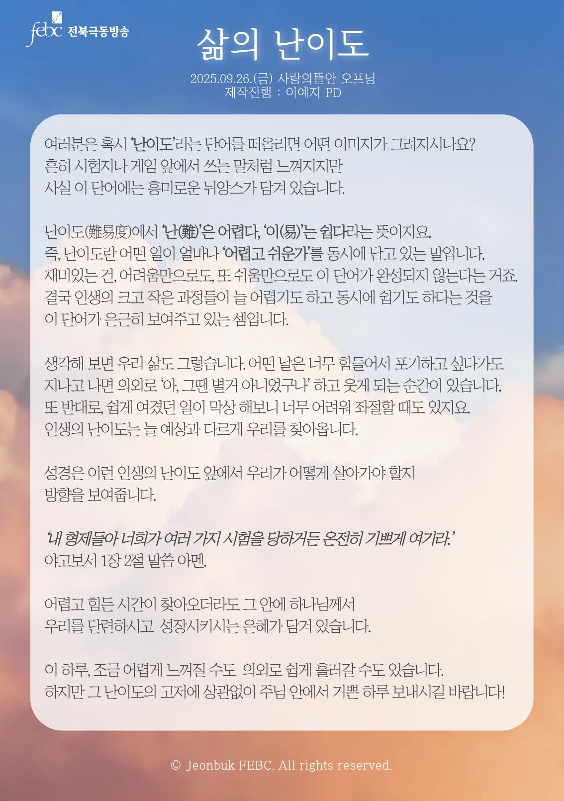 [전북] 25.09.26.(금) 사랑의뜰안 오프닝 "삶의 난이도"