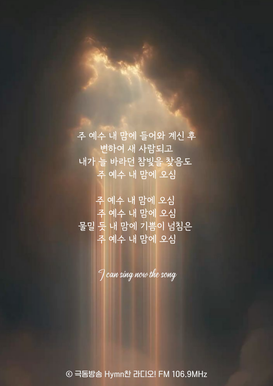 주 예수 내 맘에 오심 주 예수 내 맘에 오심