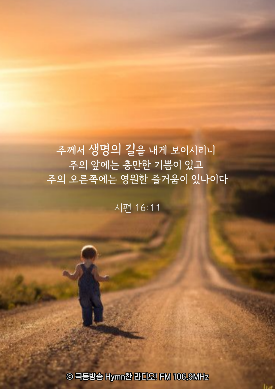 주께서 생명의 길을 내게 보이시리니 주의 앞에는 충만한 기쁨이 있고 주의 오른쪽에는 영원한 즐거움이 있나이다