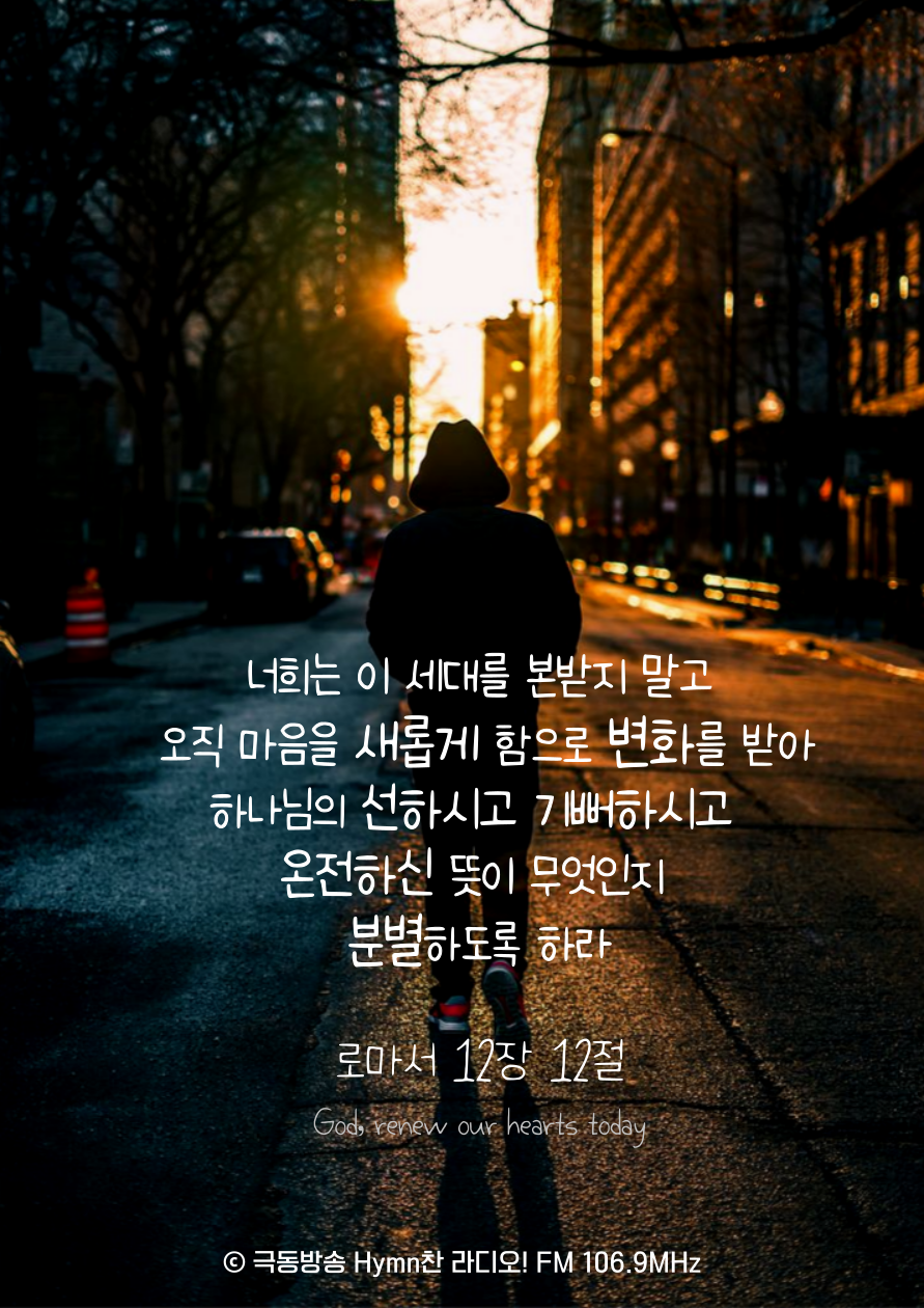 너희는 이 세대를 본받지 말고 오직 마음을 새롭게 함으로 변화를 받아 하나님의 선하시고 기뻐하시고 온전하신 뜻이 무엇인지 분별하도록 하라