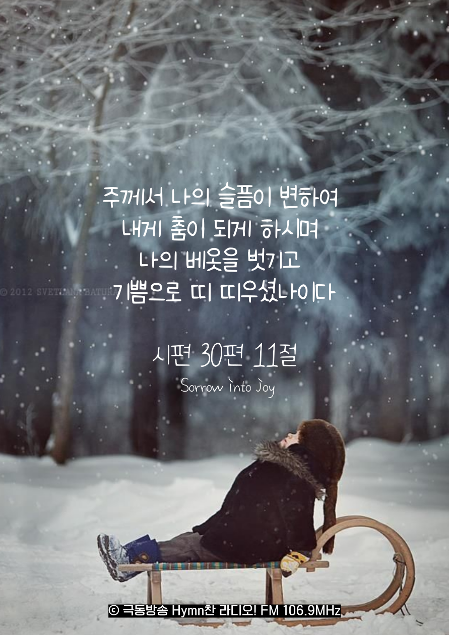 주께서 나의 슬픔이 변하여 내게 춤이 되게 하시며 나의 베옷을 벗기고 기쁨으로 띠 띠우셨나이다