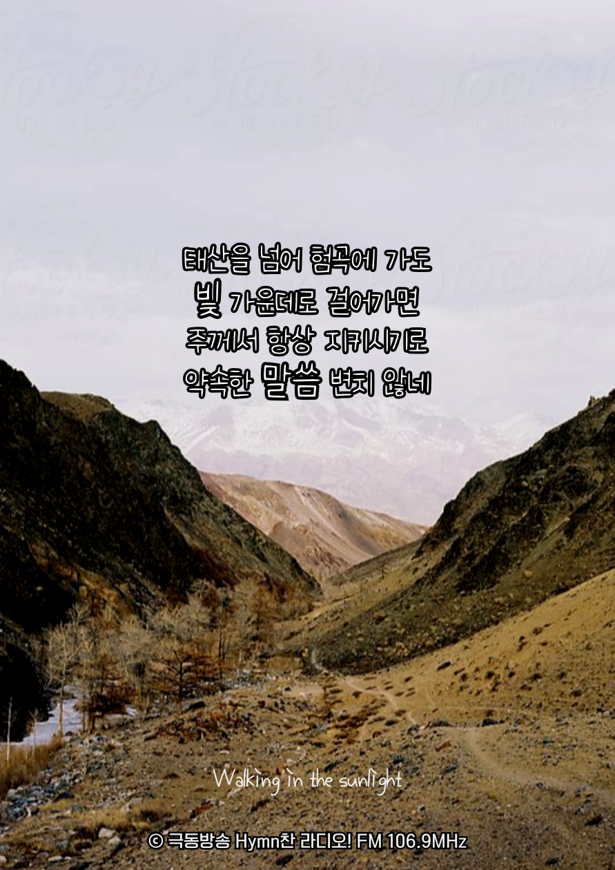 태산을 넘어 험곡에 가도 빛 가운데로 걸어가면 주님께서 우리를 지키시기로 약속하셨기에 걱정 없는 오늘!