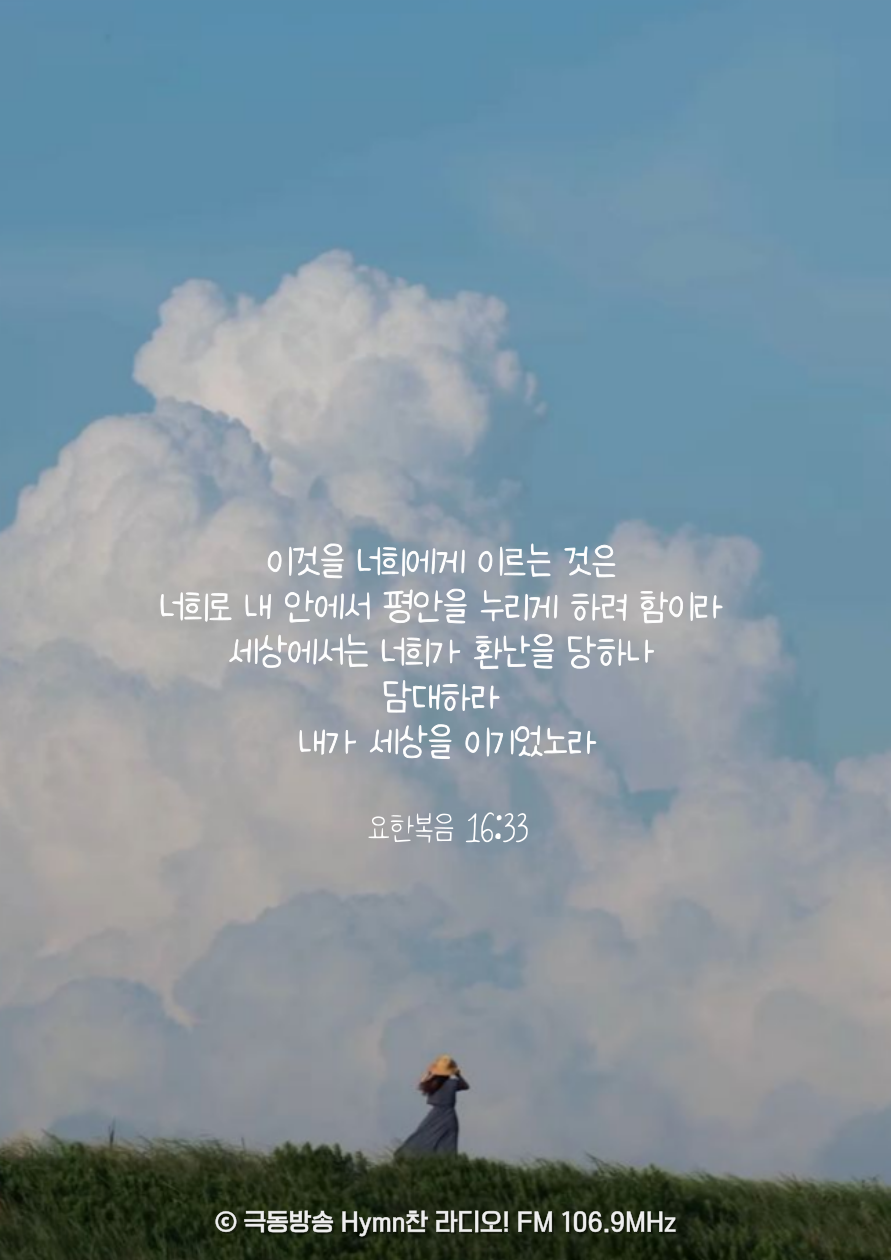 살아가면서 이런저런 환난을 당하지 않는 사람이 있을까요? 왜 나만 겪는 고난이냐고! 왜 나만 이렇게 힘이 드냐고! 하나님께 투정부리듯 우리는 하루하루를 살아내고 있지만, 주님은 말씀하시죠. 세상에서는 고난을 경험하지만, 주님은 이미 세상을 이기셨다고요. 세상을 이기신 주님이 우리 편이 되시기에, 우리는 담대하게 우리에게 주어진 또 한번의 하루를 맞이할 수 있을 줄로 믿습니다.
